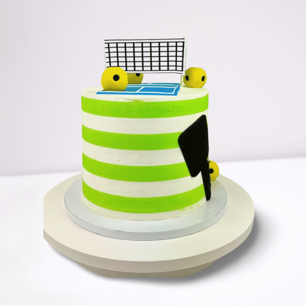 Four layer cake fully edible including the net. The pickleballs are cake pops.